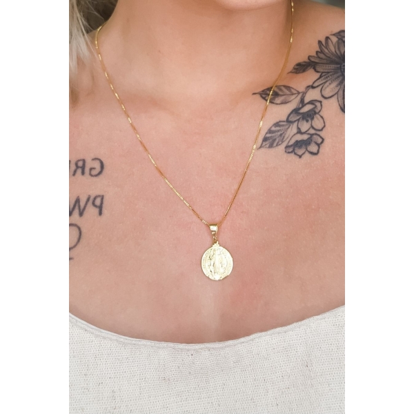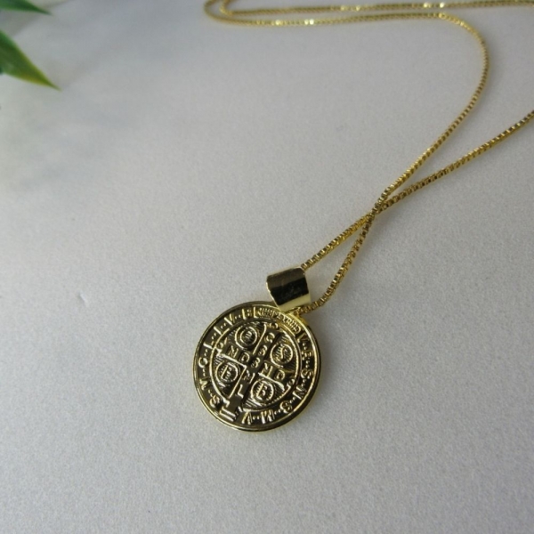 Este colar possui um pingente de São Bento, banhado em ouro 18k, oferecendo um visual espiritual e elegante. O design detalhado e simbólico torna esta peça perfeita para uso diário ou para ocasiões especiais. Ideal para quem busca uma joia cheia de proteção e estilo.